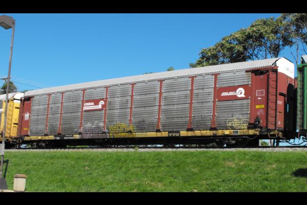TTGX 990506is seen in the consist of CSX M216-24 at Crestline, OH on 6/26/25. Rack number is CR 10728, built 12-96 and is now owned by CSX.