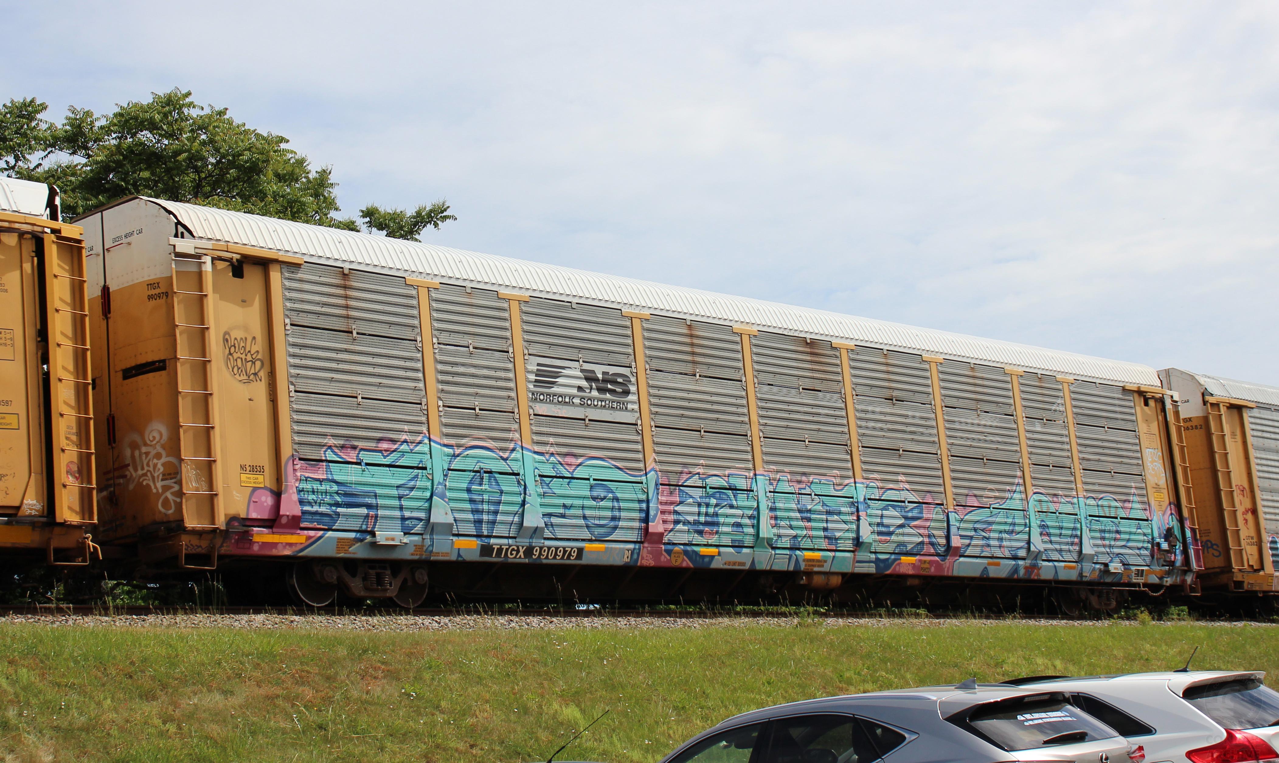 TTGX 990979is seen in the consist of CSX M217-28 at Newark, DE on 5/28/23. Rack was built as CR 9745, a CR ML2Lclass rack, in 10-93. It was then rebuilt, repainted and renumbered to NS 28535 in 9-15 by MEI ESTL. Rack is now classed FB553 by NS.