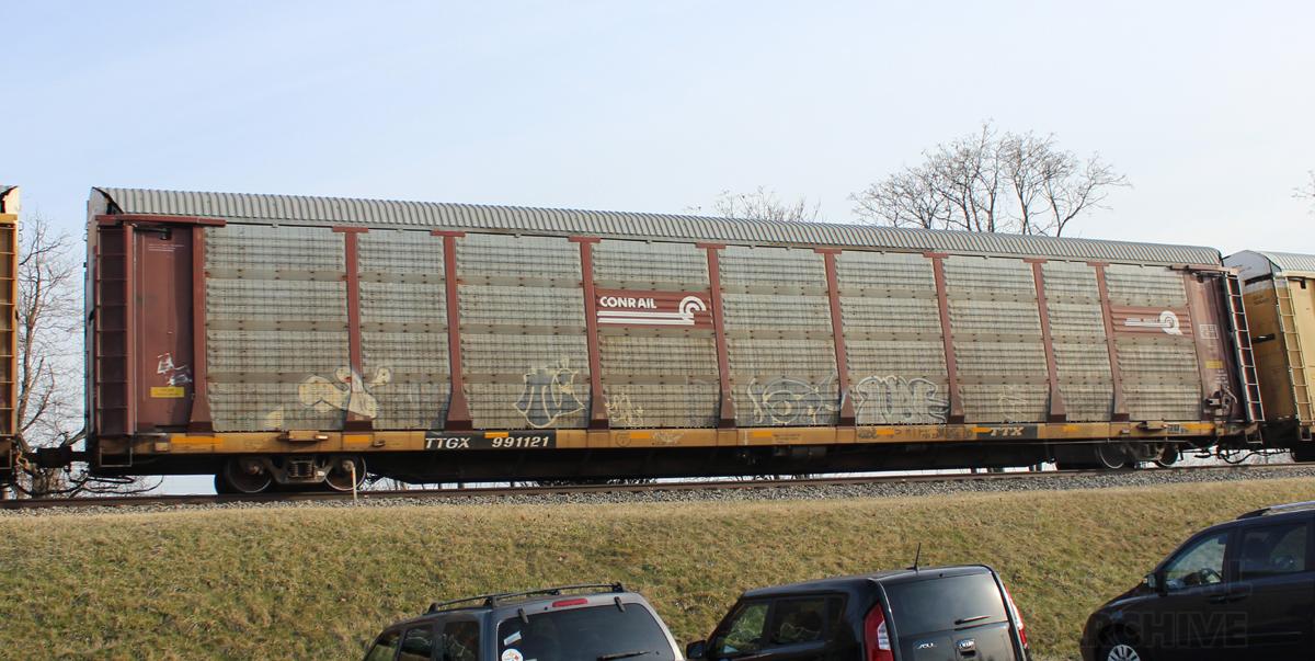TTGX 991121 is seen in the consist of CSX Q217-25 at Newark, DE on 3/25/15. Rack number is CR 10735, built 12-96, and is now owned by NS.