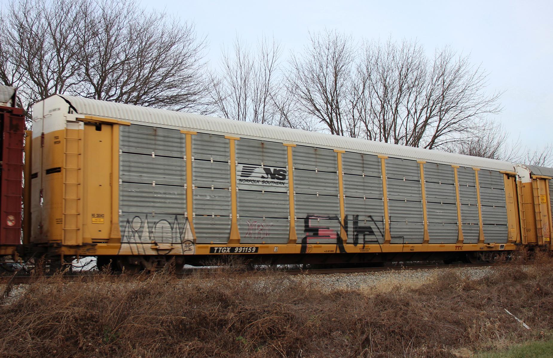 TTGX 991159 is seen in the consist of CSX Q216-17 at Newark, DE on 12/21/19. Rack was built as a unknown CR ML2L class rack in 3-94, then was rebuilt, repainted and renumbered to NS 28542 in 1-16. Rack is now classed FB554 by NS.
