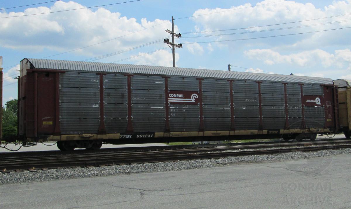 TTGX 991241 is seen in the consist of CSX Q216 at Elsmere, DE on 6/15/13. Rack number is CR 9695, built 9-93 and is now owned by NS.