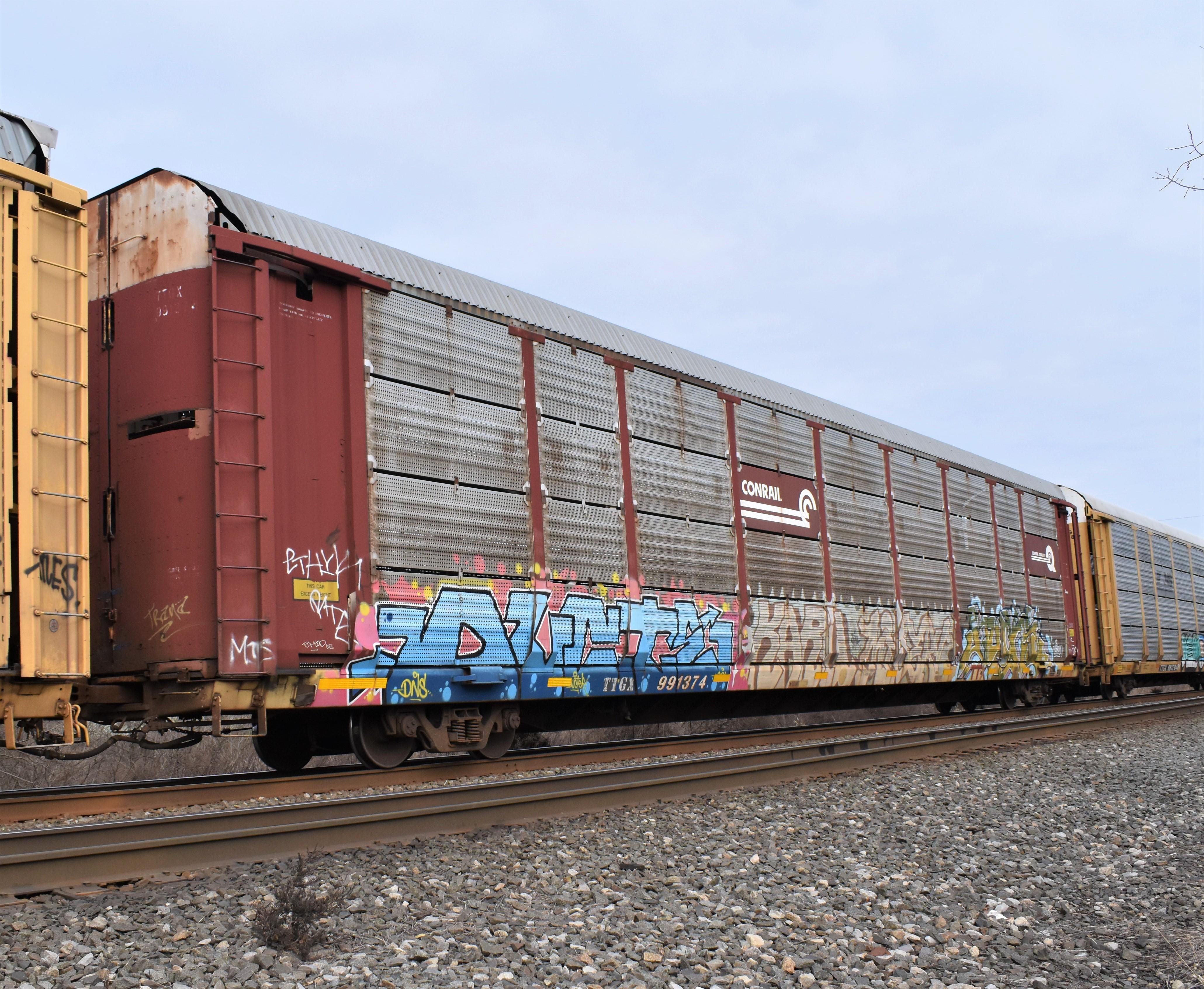 Conrail. TTGX #991374 on west Norfolk Southern auto rack train. Port Reading Junction, Manville, NJ. on December 27, 2022. Vandalism is out of hand!