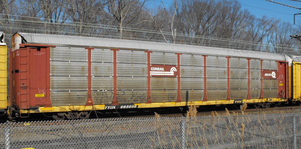 TTGX 993006 is seen in NS 36A at Newport, DE on 12/16/13. Rack number is CR 10005, built 3-94 and is now owned by CSX.