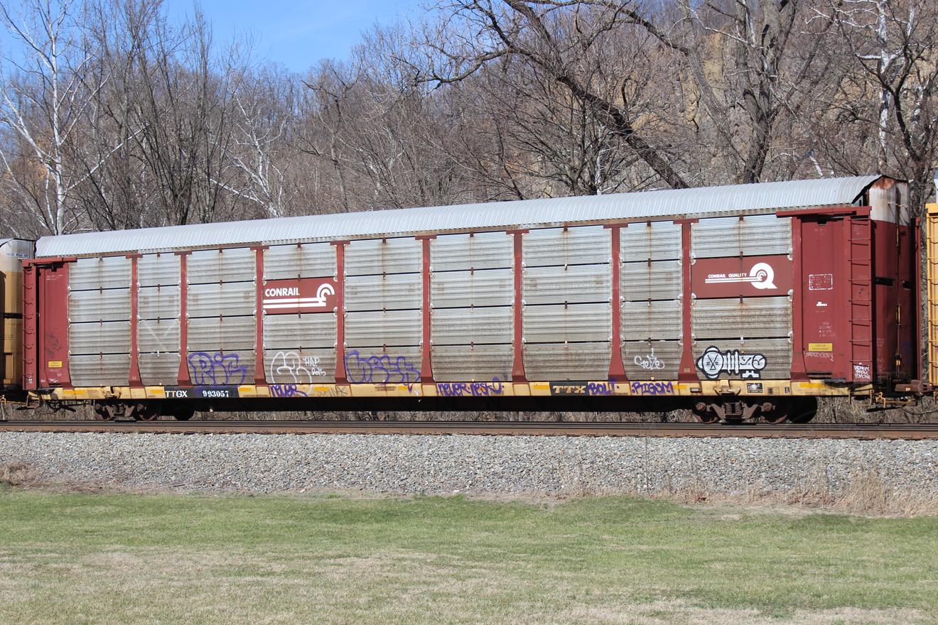 Previous Next TTGX 993057 is on a westbound at Corriganville, MD on 3/31/18. Rack number is CR 9928 and is now owned by NS. Photo By Donnie Lee Equipment Type TTGX Bi-Levels Post Conrail Owner Norfolk Southern Year 2018 Original Date 3/31/18 Collection CRHS Conrail Photo Archive Contributions