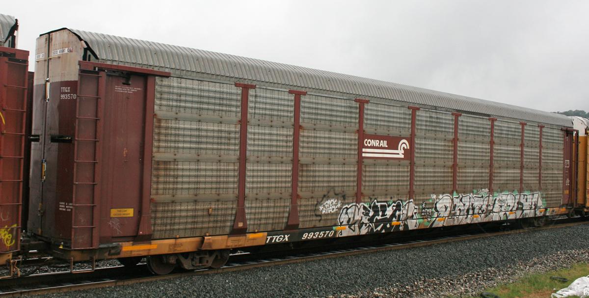 Previous Next Rack number is CR 10883, rack built by Thrall. Photo By Donnie Lee Location Details Virginia Ave Equipment Type TTGX Bi-Levels Year 2012 Original Date 9/2/12 Collection CRHS Conrail Photo Archive Contributions
