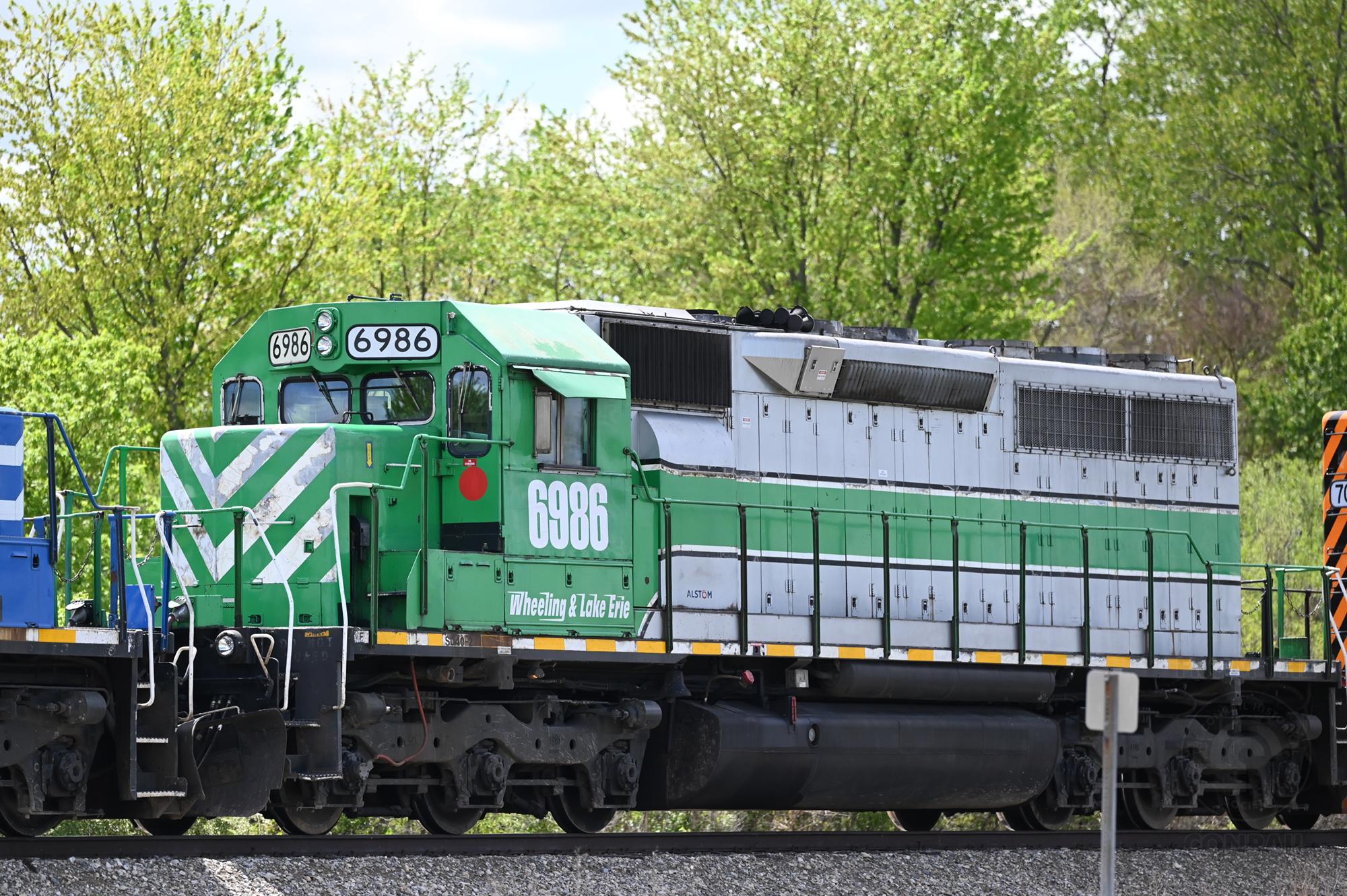 WE 6986, still in ex-FURX colors, is on a train in Bellevue.