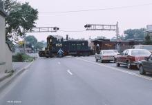 As of the time of this posting, unless you are quite young, many, if not most railfans in Pennsylvania and beyond are familiar with the Brouse brothers regarding railroading and associated interests. Here Harold E. ("Ed") Brouse is engineer of the West Shore 8525 and brother Reuben Scott Brouse is flagman as this day's West Shore Rail Excursions trip from Time Markets at the west end of Lewisburg to Montandon is returning west, crossing busy US Rt. 15 in Lewisburg.