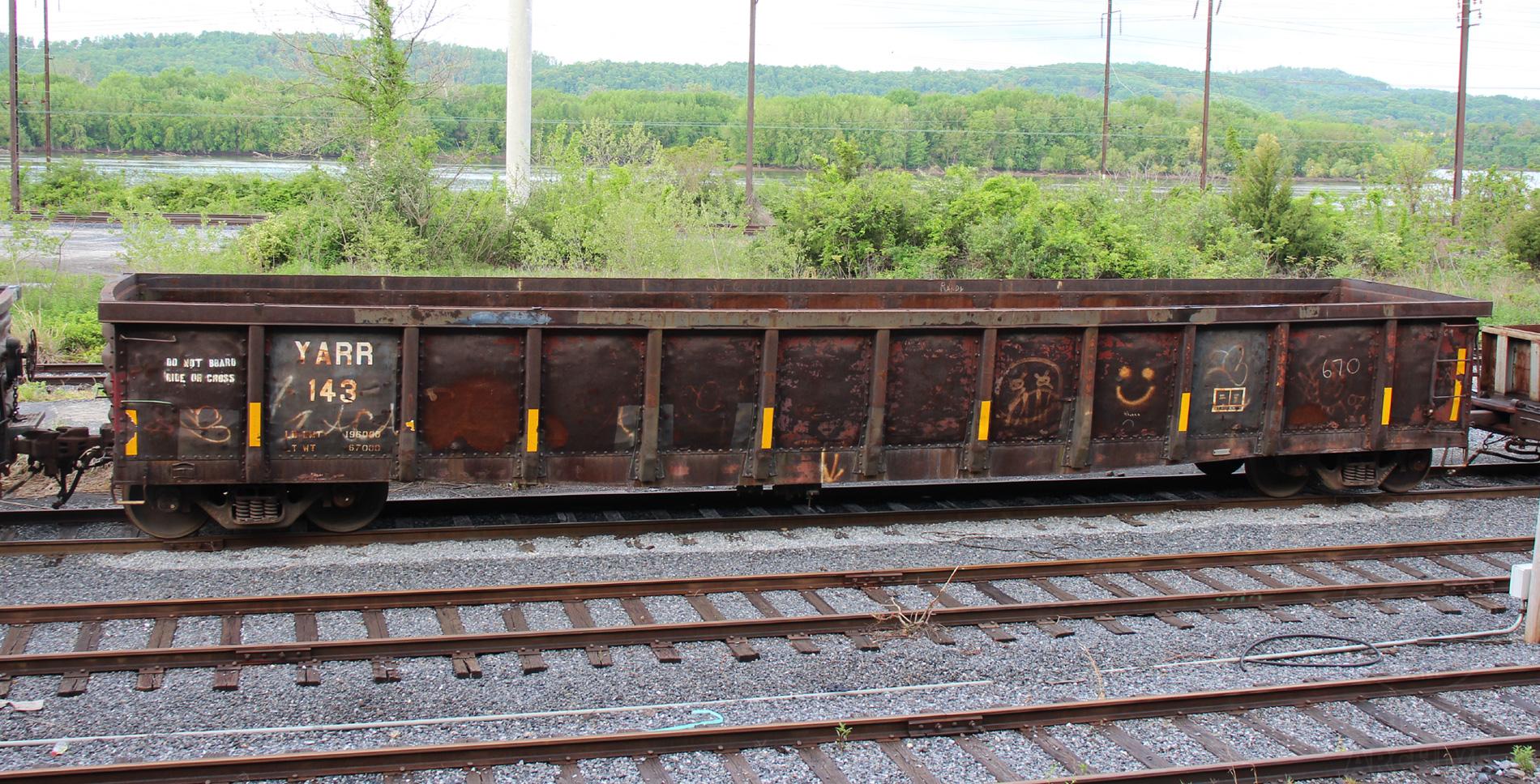 YARR 143 is seen at Steelton, PA on 5/16/20. Car is ex CR 581822 and was built 4-80 by CR. Photo by Chris Carangi.