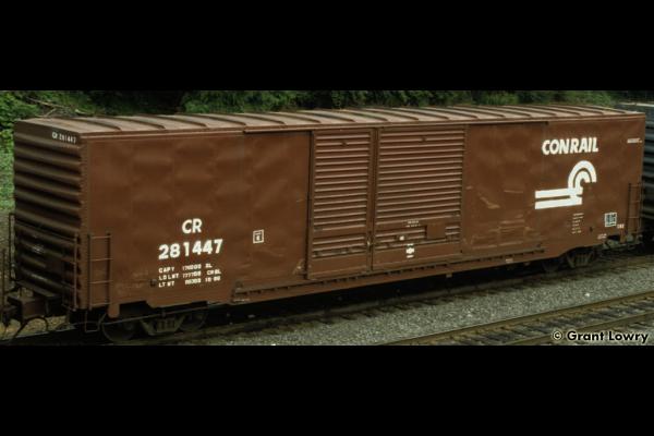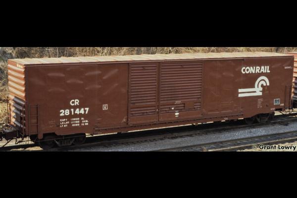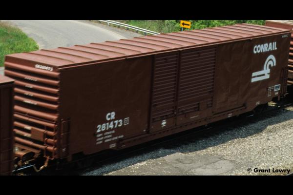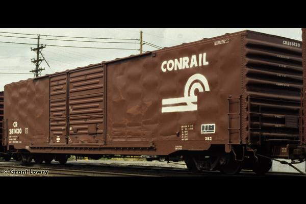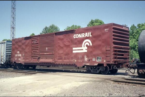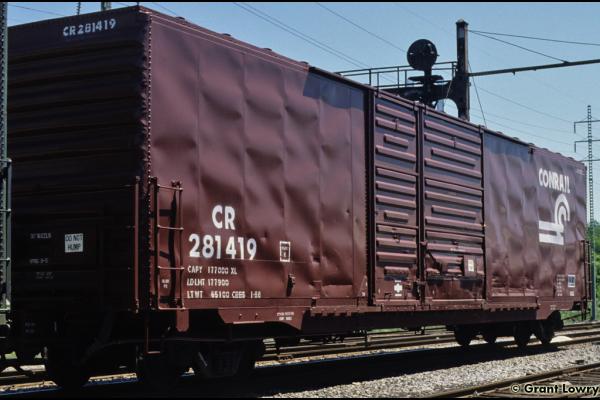 The X82s were built by Pullman-Standard in 1974 for the PC, a class of 277 cars. They were delivered with Pullman-style doors, and most retrofitted doors were of the Youngstown type. CR 220225-220265, 281400-281635 ex PC same #.