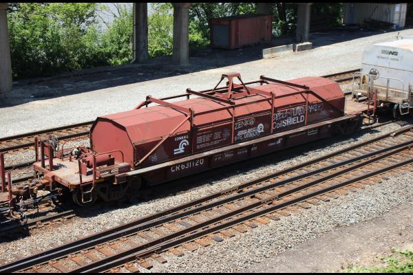 CR. PC hopper on freight with FRED. Piscataway, NJ 5/14/83