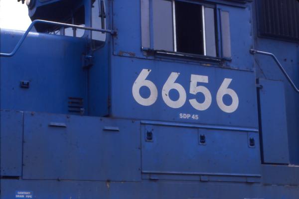 CR 6656 and another EL painted SD45-2 help a westbound TV at Benny, 3/78