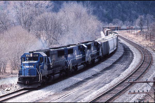 CR 6721 leads eastbound Conrail upgrade at Gallitzin, PA on June 15, 1985