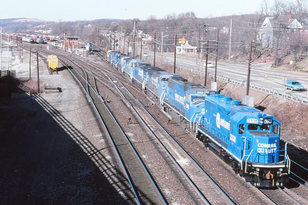 CR 3353 leads a westbound TV train up the mountain at Bennington, 4/80