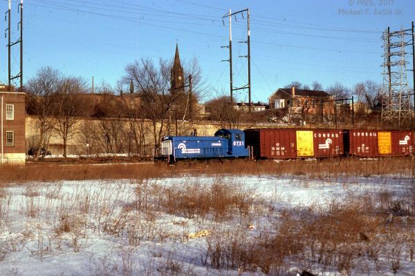 CR 8721 easily handles 2 boxcars on the Venice branch in the Manayunk section of Philadelphia, Pa. 2/9/1985