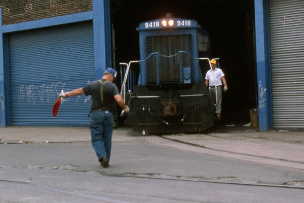 CR 9418 exits the G. B. Goldman Co. building on Westmoreland Near Tulip St. in Philly, 1987.