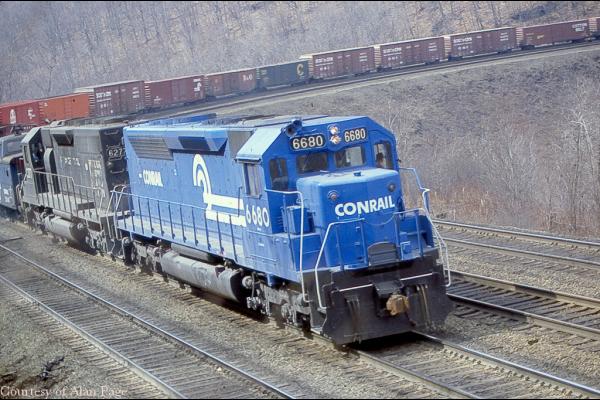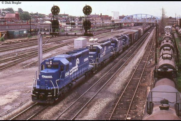 CR 6281 & SD-45 on eastbound TV train, Adams Station, NJ, 1/26/80