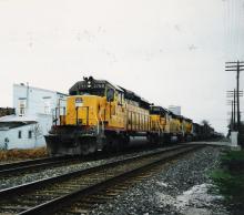UP 3769, 3322, and a GE(along with a couple CR units) leads train COIN-0 at Fortville, IN on May 20, 1996