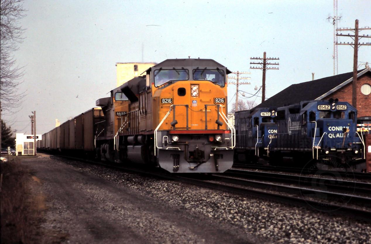 Previous Next UP 8216 and 6695 leads empty coal train UDM-8WH at Bryan, OH on April 2, 1999. This is one is coming back from Detroit Edison's Monroe, MI power plant. Chris Howe photo Photo By Chris Howe Year 1999 Original Date 4/2/99 Location City Bryan OH Subject(s) Foreign Power on Conrail Collection CRHS Conrail Photo Archive Contributions