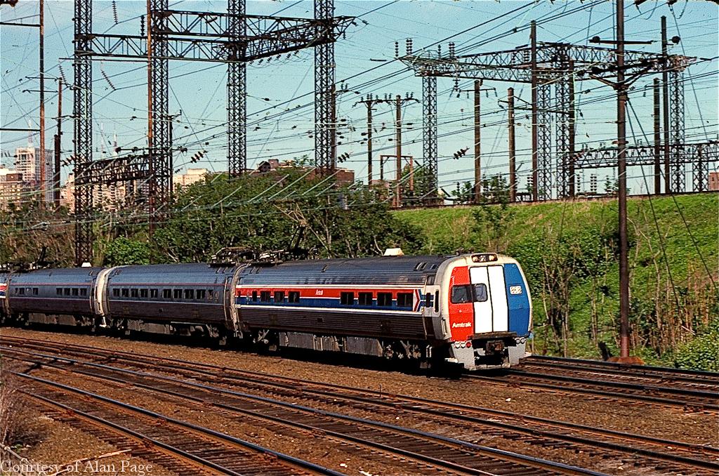 Amtrak Metroliner 868 (Budd/GE 1969-built ex-PC 868) roars through Philadelphia near Arsenal tower on May 15, 1977. The day was special as PRR GG-1 4935 was expected any moment on her debut run following restoration by Amtrak and the "Friends of the GG-1."