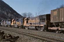 Previous Next Up front, SD40-2 6446 leads ex-PC SD45's 6134 and 6156, followed by Sante Fe GP-39-2 3645 and U23B 6312, as they charge up the curve in March, 1979. Photo By Alan Page Year 1979 Original Date 3/17/79 Location City Altoona PA Conrail Number 6156 Additional Galleries Alan Page's CR: 5-1978 to 4-1979 Subject(s) Foreign Power on Conrail Collection CRHS Conrail Photo Archive Contributions