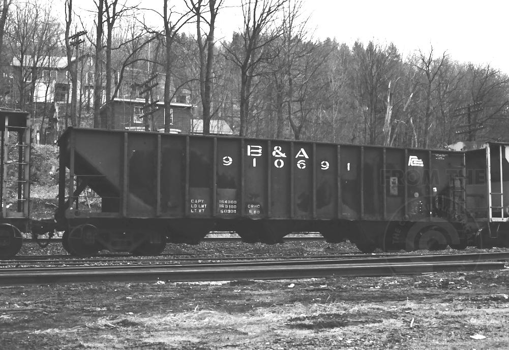 The Boston & Albany lives! Three bay hopper with "B&A" sublettering at Chester, MA. on March 14, 1981. Used in captive MOW service.