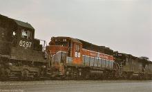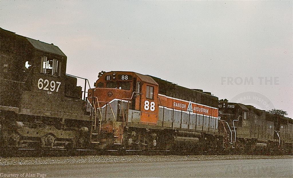 The Conway engine terminal power lineup included CR SD40 6297 (ex-PC 6044), leased BAR GP38 88, and GP38 7913 in August, 1977.