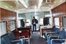 Previous Next Steve Ondik's dad, Pat Livingston and his son chat with one of the museum volunteers inside the restored Broadway Limited observation car Mountain View at the Altoona RR museum. Photo By Chris Howe Year 2008 Original Date 10/26/08 Collection CRHS Conrail Photo Archive Contributions