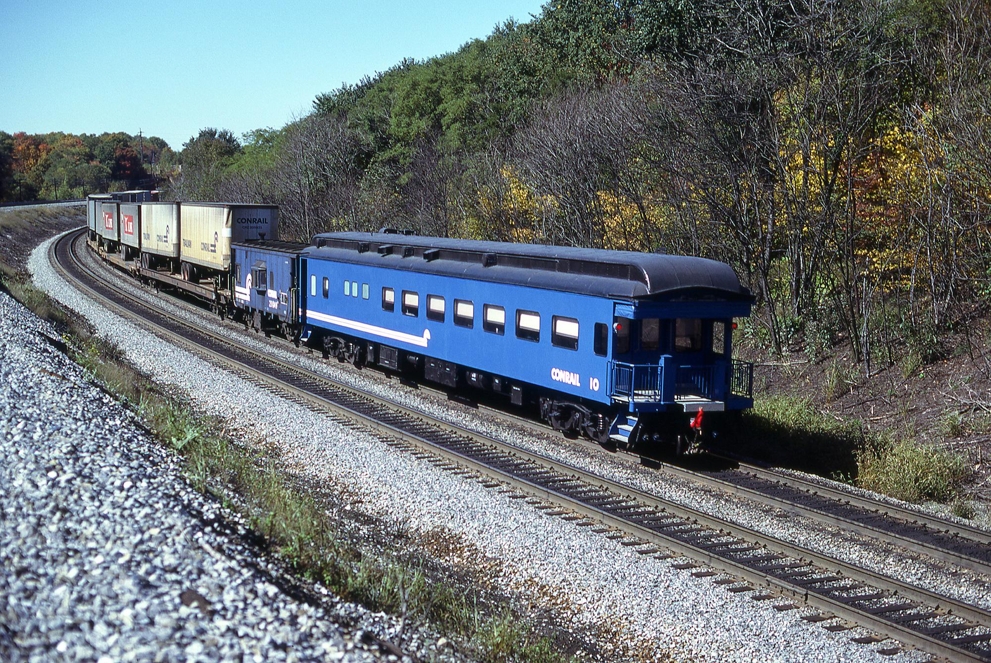 Previous Next Conrail Office Car 10 brings up the rear of a WB TV Train, Gallitzin, PA, 10/2/82. Photo By Stanley Short Year 1982 Original Date 10/2/82 Location City Gallitzin PA Conrail Number 10 Additional Galleries Stanley Short's Conrail Photos Subject(s) OCS Passenger Equipment Collection CRHS Conrail Photo Archive Contributions