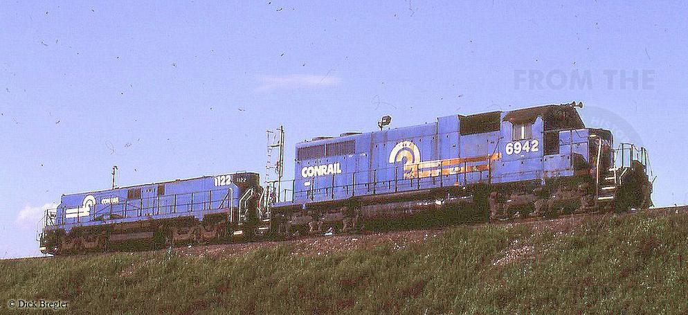 Conrail SD38 6942 (ex-PC 6942) is seen with MT6 1122 (ex-CR 6877, exx-PC 6877, nee-PRR 8677) at Conway Yard in 1983,