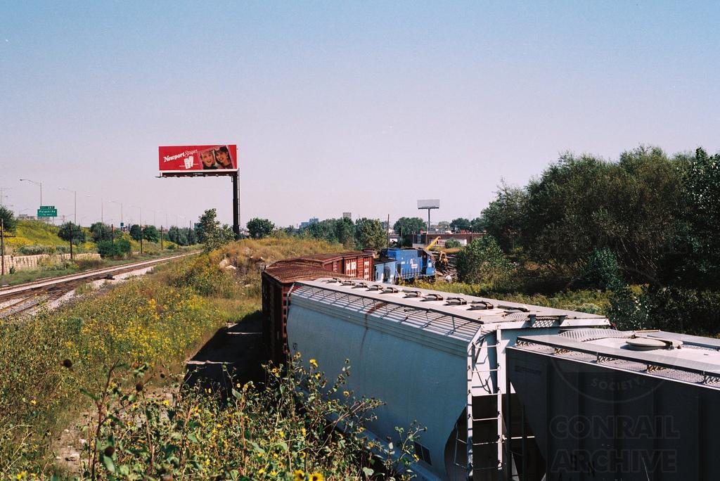 On the far western end of the old Chicago River & Indiana territory, a Conrail local freight led by GP15-1 1678 is returning to Ashland Avenue Yard after having switched the industrial district near LeMoyne in September 1990. The IC Joliet Line can be seen to the left, while I-55 is at the far left. Doug Davidson photo with permission