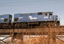 Conrail GP-15 #1695 leads an eastbound on the Delair bridge approach (The Woodwork) next to Lewis St. in Philadelphia, PA. March 2, 1985
