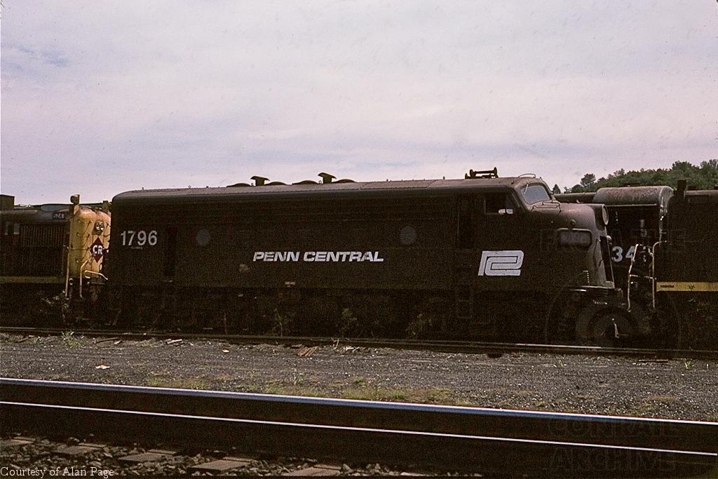 Former PC F-7A 1796 rests in the Juniata shops deadline in August, 1977. The ancient EMD cab-unit may end it's days without a CR stencil or a return to the active roster.