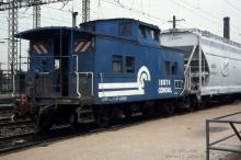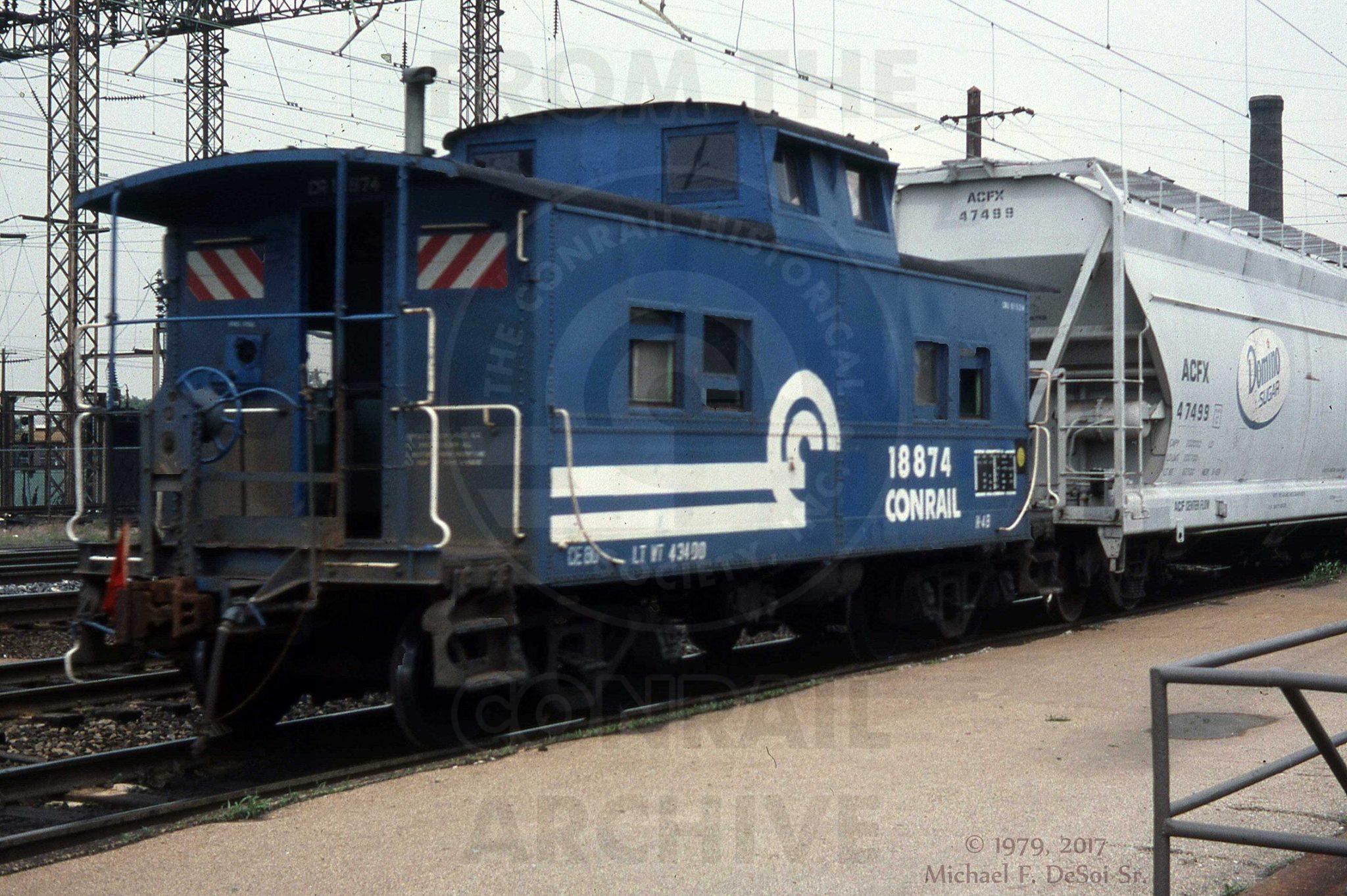 Conrail N4B caboose #18874 (ex CNJ) brings up the rear of an eastbound going through the station at Frankford Junction in Philadelphia, PA. May 15, 1979