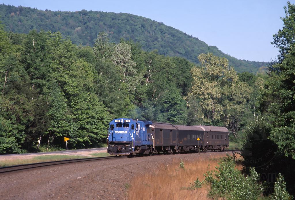 Track geometry train, symboled TEST300, eastbound behind the "usual suspect", 1933, in Huntington, MA. on May 20,1991.
