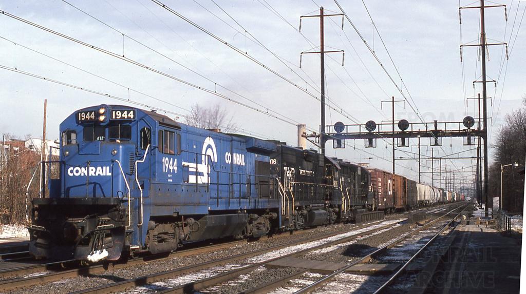 CR 1944, 8016 & a GP35 lead OIEN south under the wires on Amtrak's Northeast Corridor at North Elizabeth NJ in Feb of 1982.