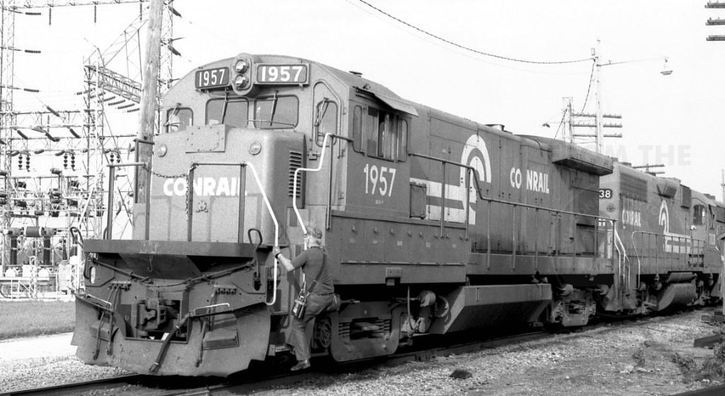 The conductor on the Conrail LOCO steps off the B23-7 prepairing to couple onto a cut of cars at the east end of Goodman Yards off the ex PRR Red Key Line on August 8, 1980. Kevin Nelson photo with permission