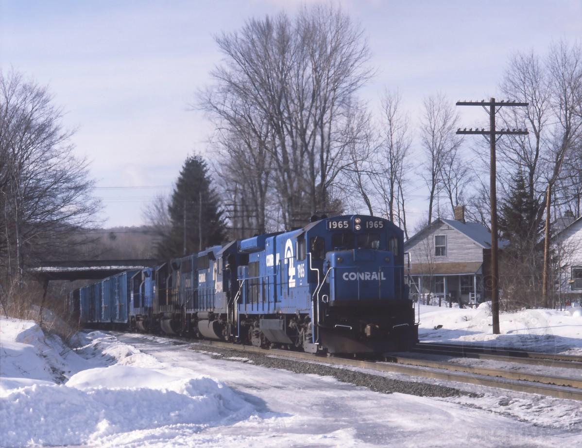B23-7 1965 leads three different EMD models on SEPW at MP 142 in Hinsdale center, MA. on Feb. 27, 1982.