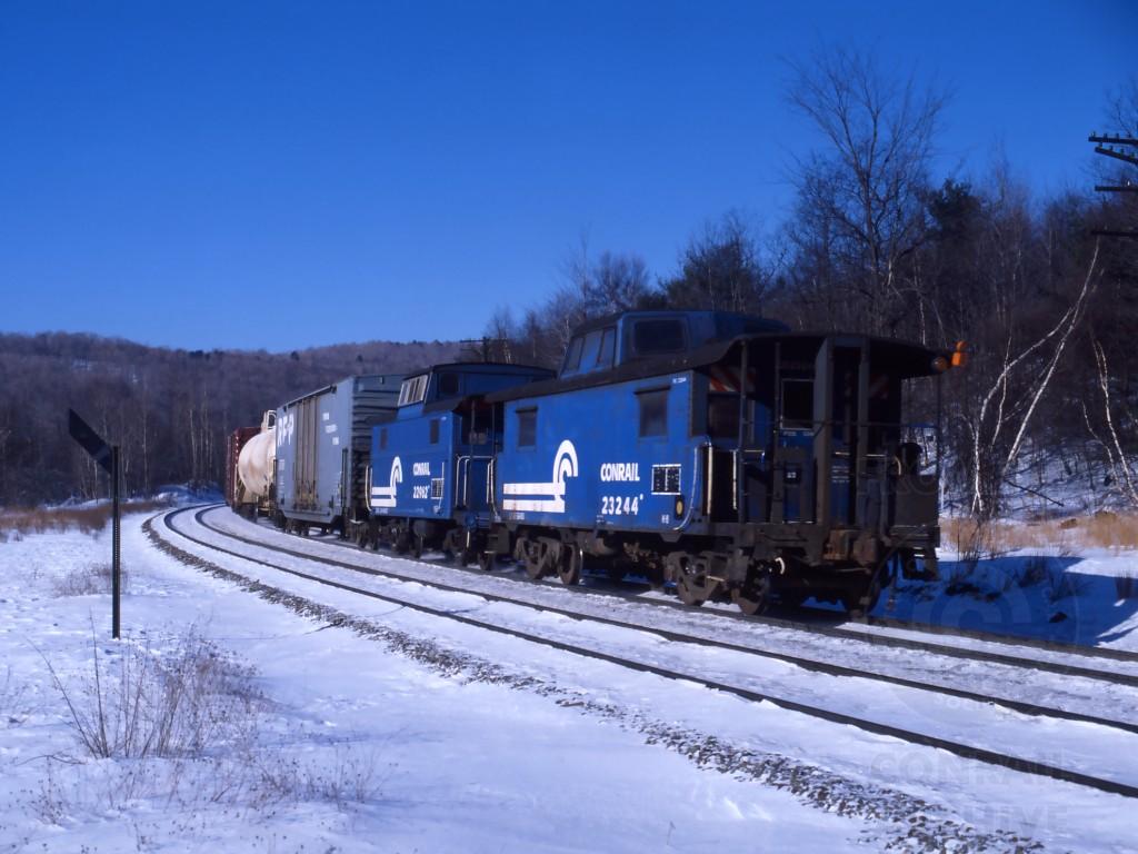 Ex Pennsy N8 cabin 23244 and N5B 22962 bring up the rear of the 1986 west at Bancroft, MA. on Dec. 27, 1980.
