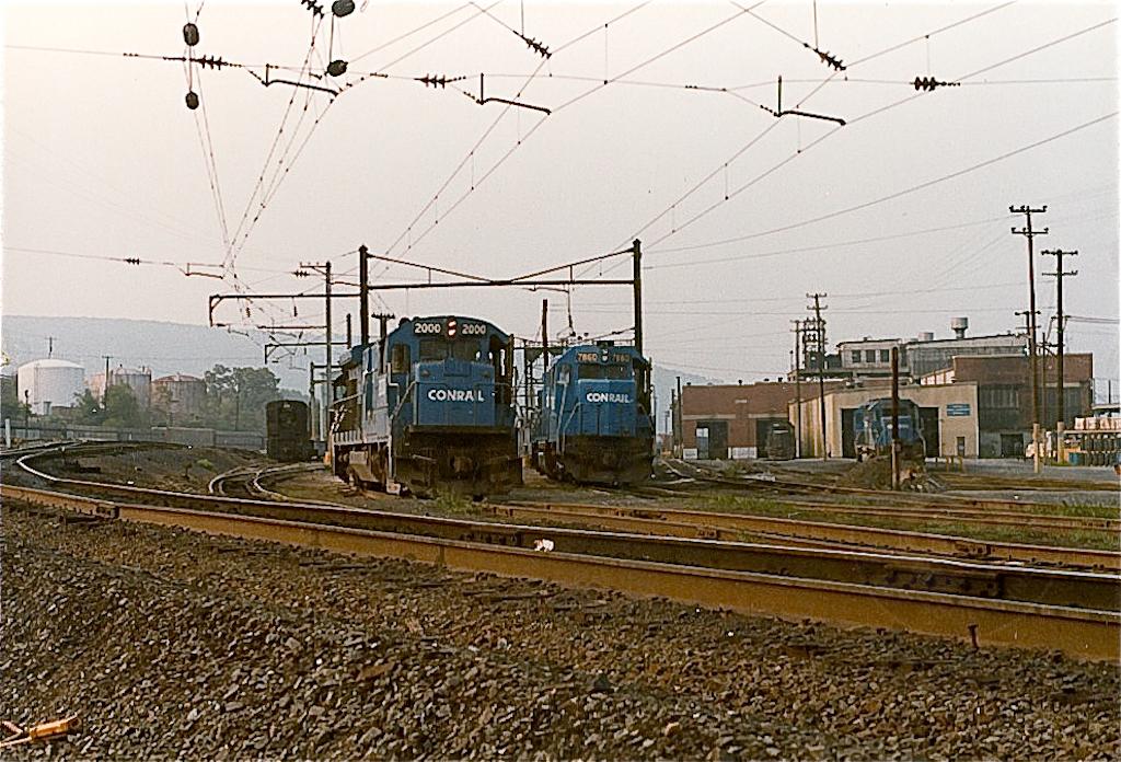 CR B23-7 2000 and GP38 7860 appear ready to head eastbound at Enola in September, 1983.