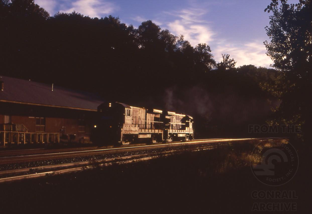 B23-7's 2017 and 1932 have just departed West Springfield yard at 07:01 on Sept. 5, 1997 as WAWS-5. They are passing the former B&A Mittineague depot on their way to "Traprock", the Lane quarry at MP 105 in Westfield.