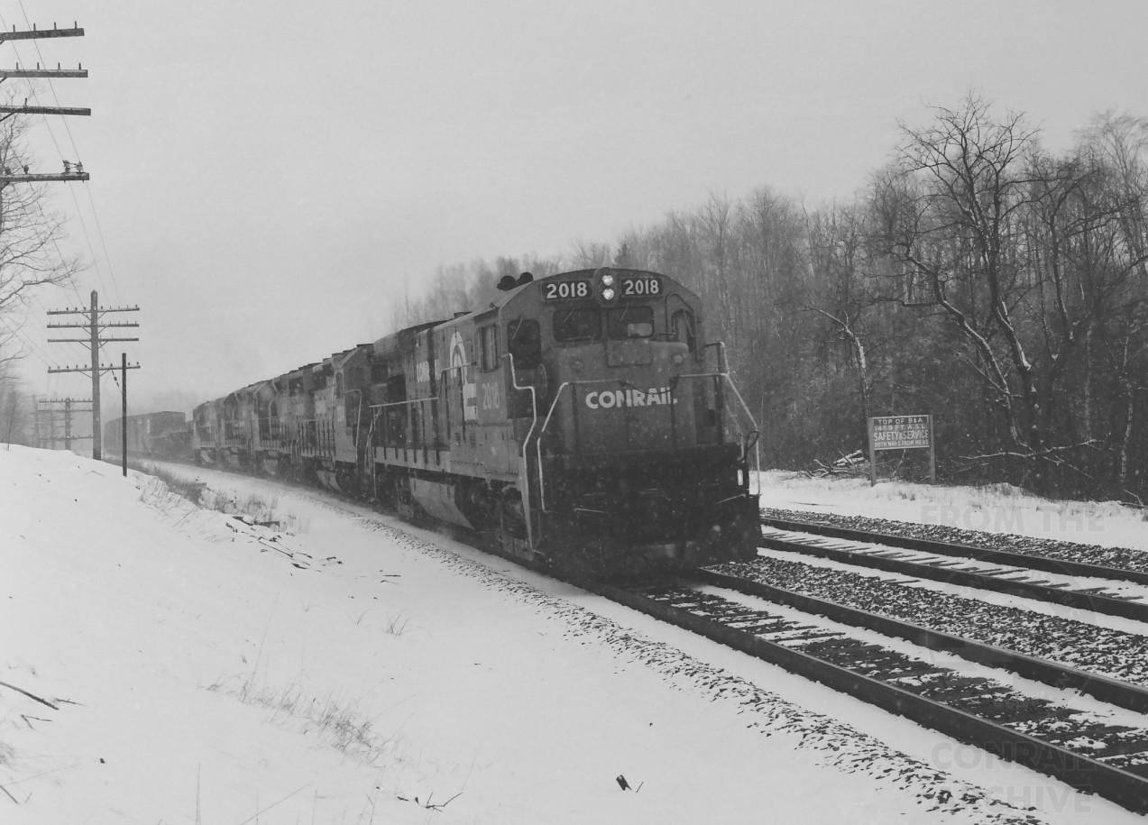 CR 2018 leading westbound tonnage over the summit of the B&A in Hinsdale, MA. on March 7, 1981.