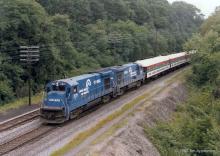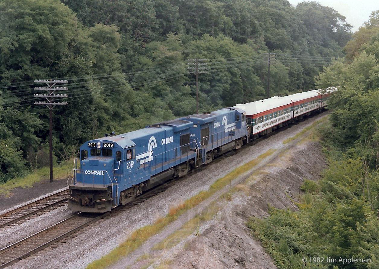 CR 2019 & 1998 B23-7s are the motive power on the James E Strates Shows carnival train heading north for its 1982 New York state venues.