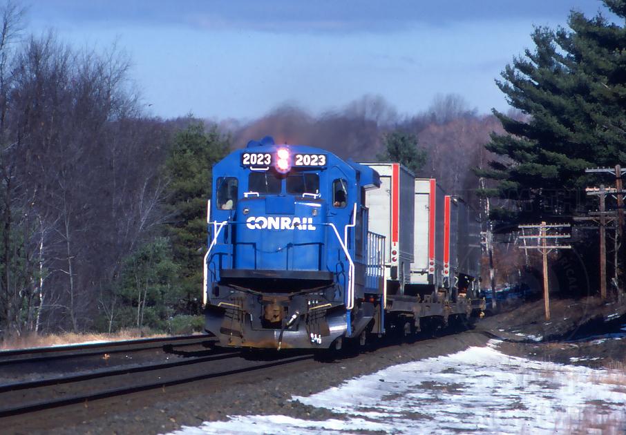 B23-7 2023 leads TV80W near MP 58 in Charlton, MA. on Jan. 22, 1988. The 2023 is the last unit in CR's 124 unit group of B23-7's.