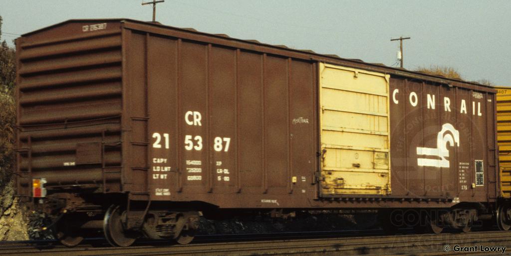 Conrail 215387 is seen at Mifflin, PA in the early 1980s. This car is equipped with a less-common Superior door, painted yellow to indicate the car is in paper service.