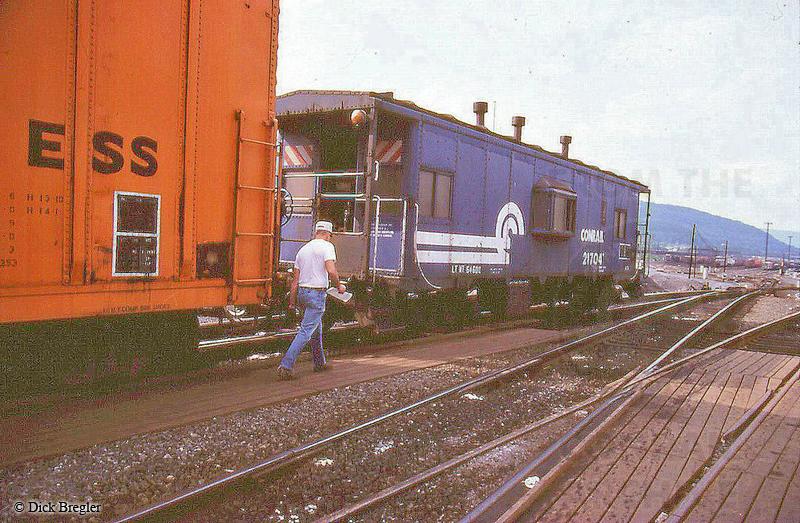 Conrail class N7A caboose 21704 is being cut off the rear of a train at the Enola hump in 1983.