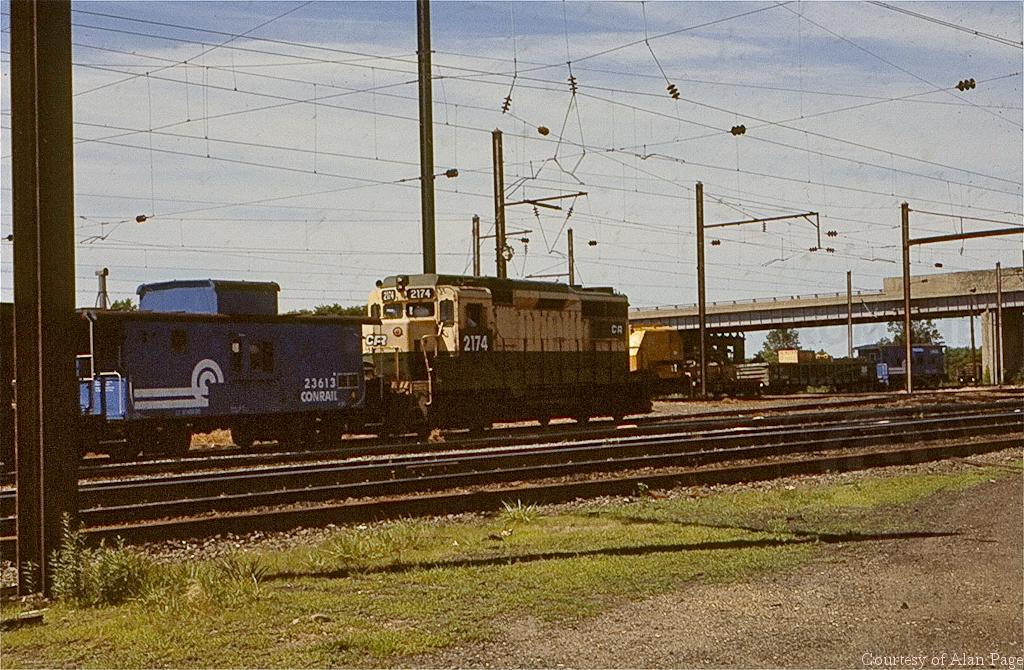 Former RDG GP-30 2174 and CR N8B class cabin 23613 (ex-NH 628) move through Morrisville yard in July, 1978.
