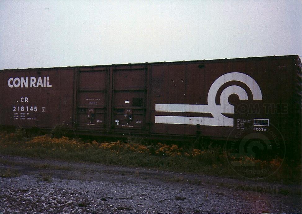CR 218145 Class BE63A at Sharpsburg, PA on 06-27-1989. The car is ex EL 67712 and was originally repainted at HCS (P62) in May of 1978. It was reweighed (but not repainted) at Meadville (CR BR) in March of 1986. This car can be modeled correctly in N scale with an MTL Greenville 60' double plug door boxcar minus the running board.