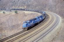 CR 3167 GP-40 leads GP-30 2194 and two other black and blue EMD SD's down Horseshoe Curve in March, 1981.