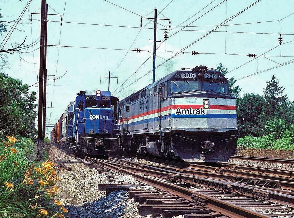Conrail GP30 2235 is seen on a local at Paradise, PA on 7/10/1982 as the Broadway Limited speeds by