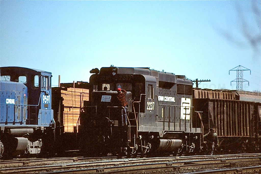 The crew makes some adjustments before PC GP-30 2237 moves some PRR hoppers at Abrams in March, 1977.